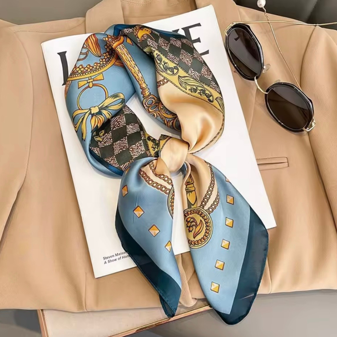 AZURE PRESTIGE to apaszka inspirowana klasycznym, biżuteryjnym wzornictwem – łańcuchy, ornamenty i subtelne geometryczne detale tworzą luksusową, ale harmonijną kompozycję.