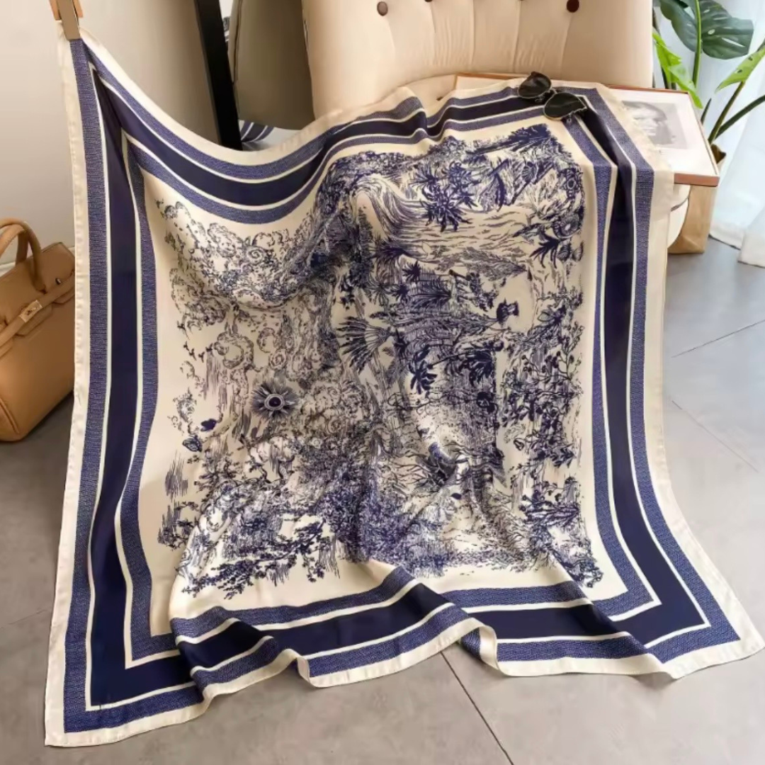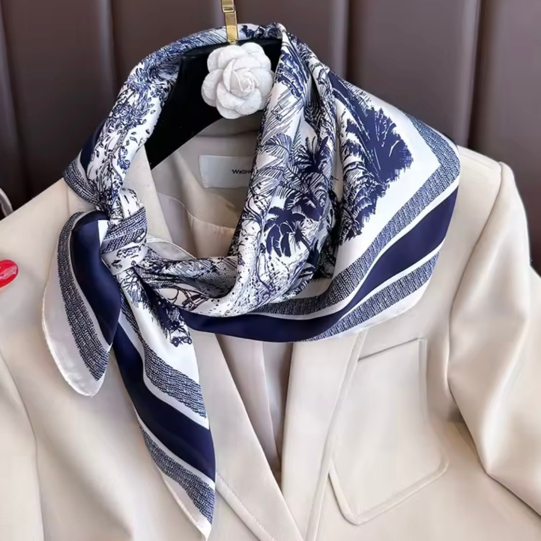 BLEU ÉLÉGANCE to duża apaszka utrzymana w ponadczasowym połączeniu głębokiego granatu i ciepłej bieli, ozdobiona subtelnym, ilustracyjnym motywem inspirowanym naturą i francuskim wzornictwem.