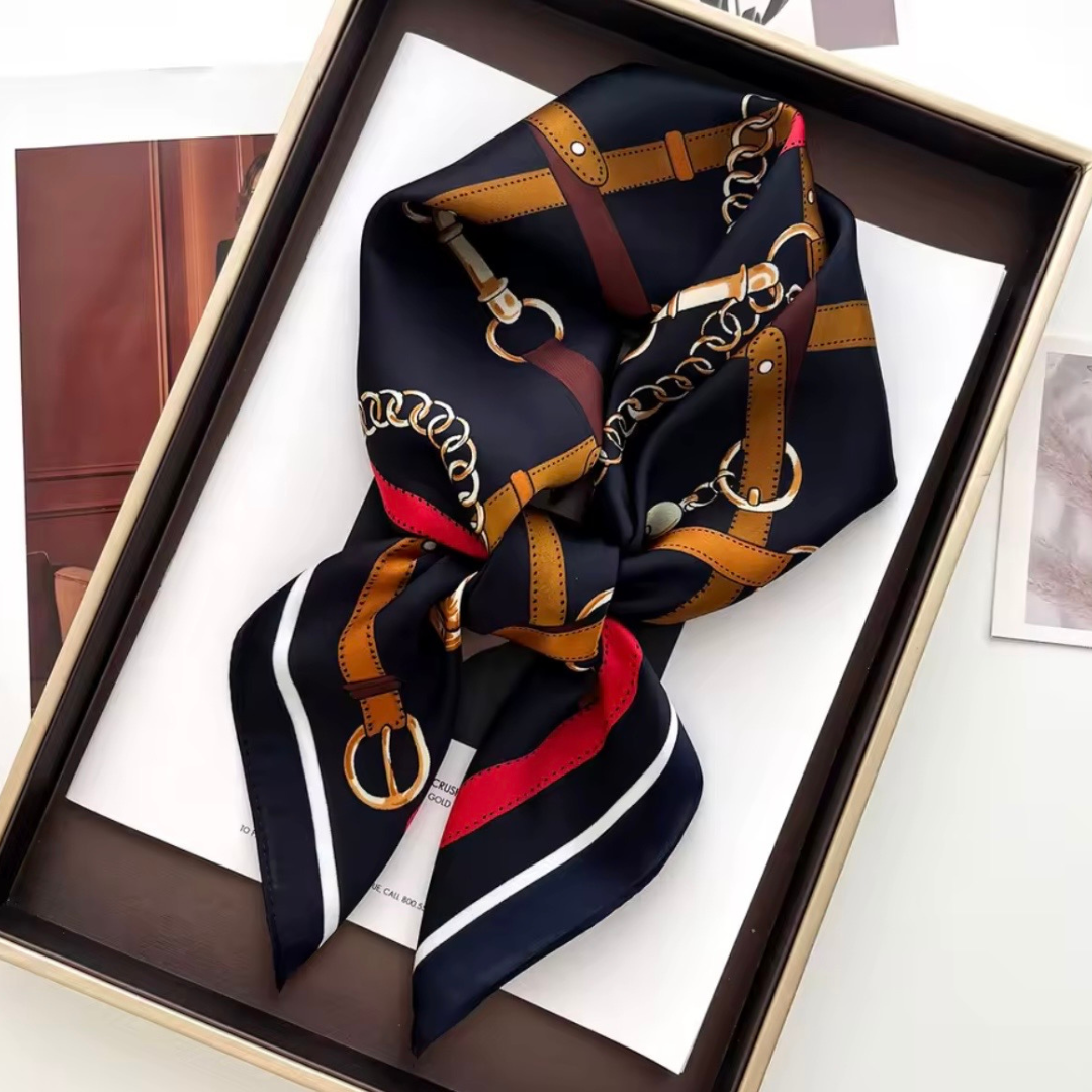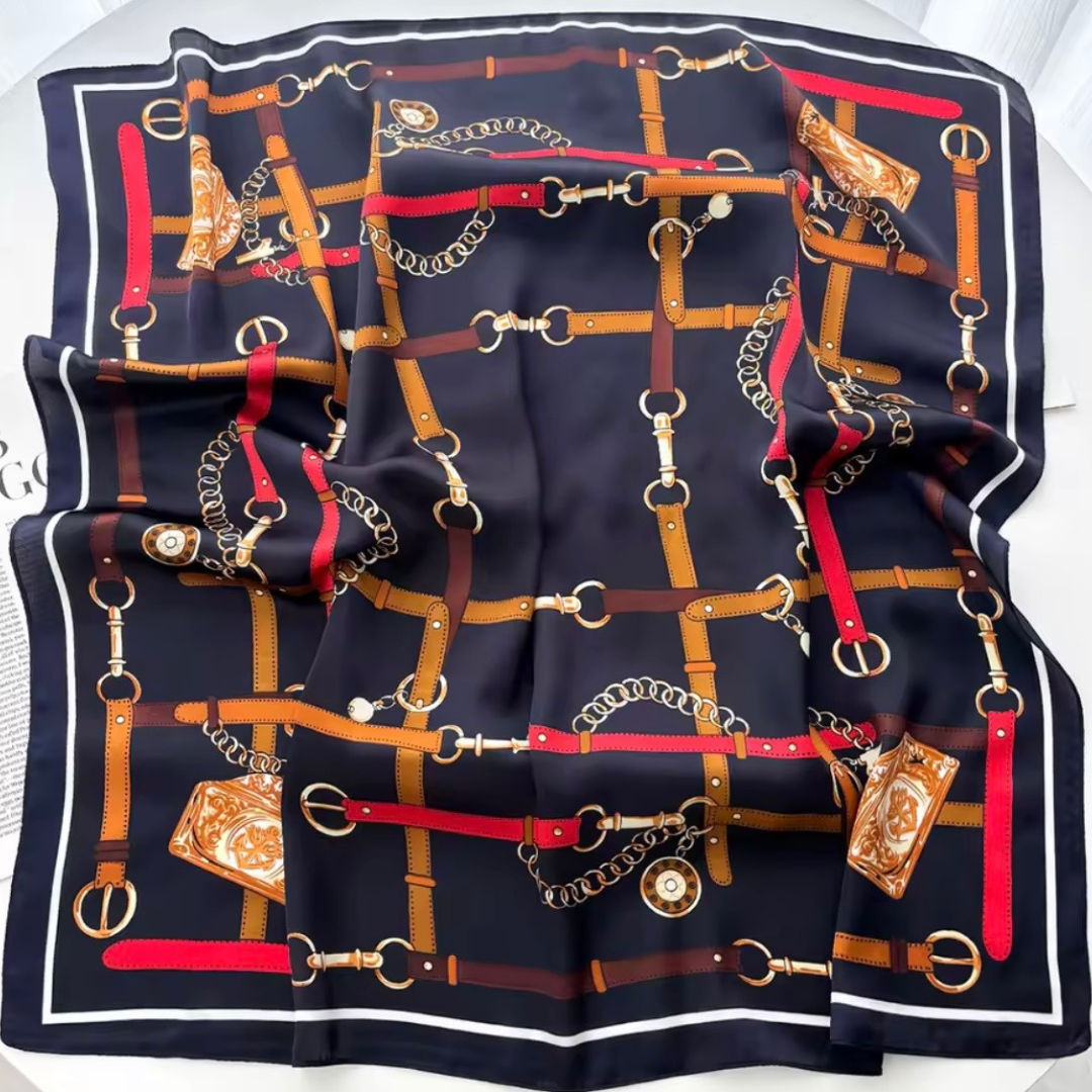 ROYAL RIDER to apaszka inspirowana klasycznymi motywami jeździeckimi – paski, łańcuchy i złote detale tworzą wyrazistą, luksusową kompozycję na głębokim granatowym tle.