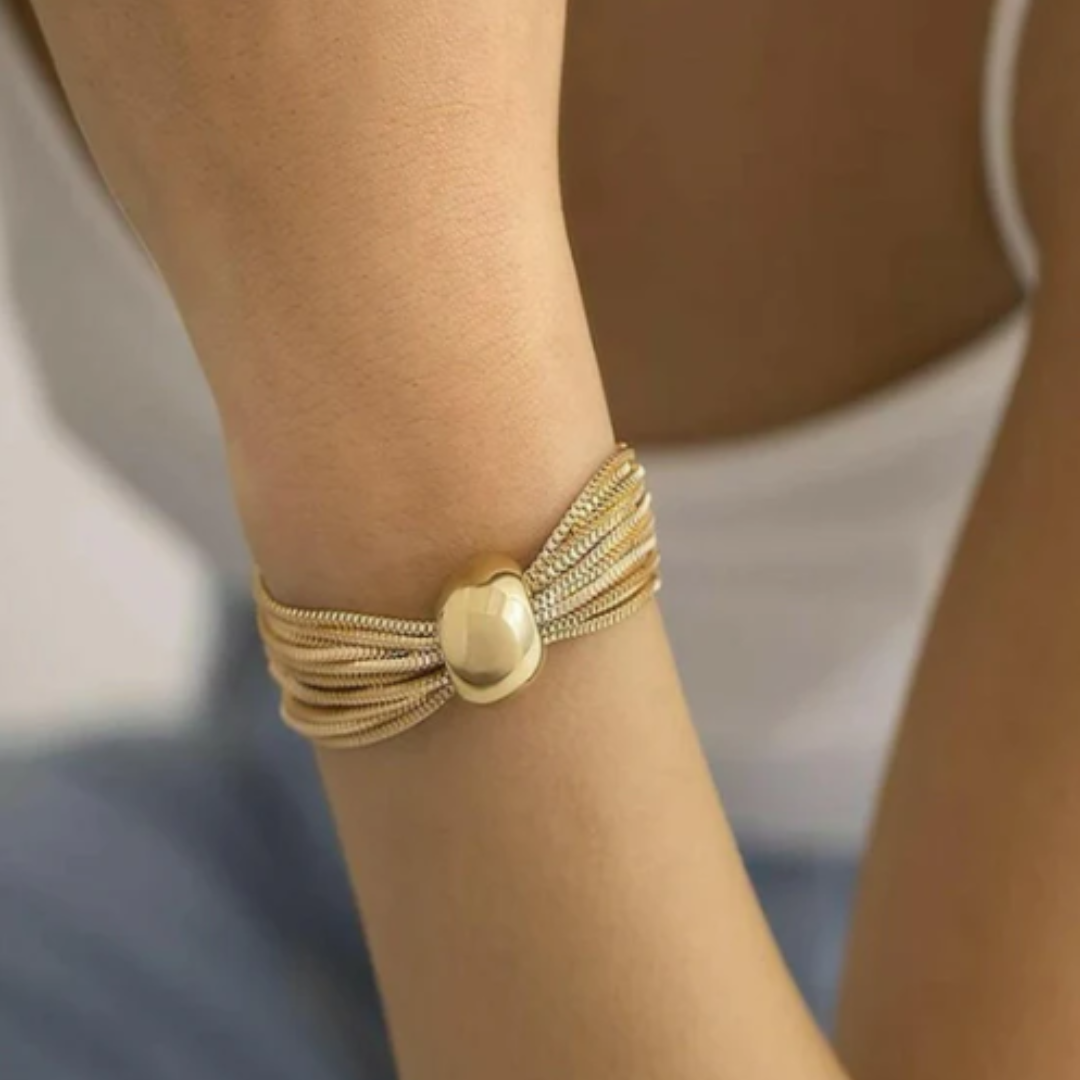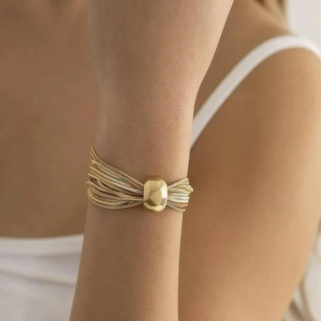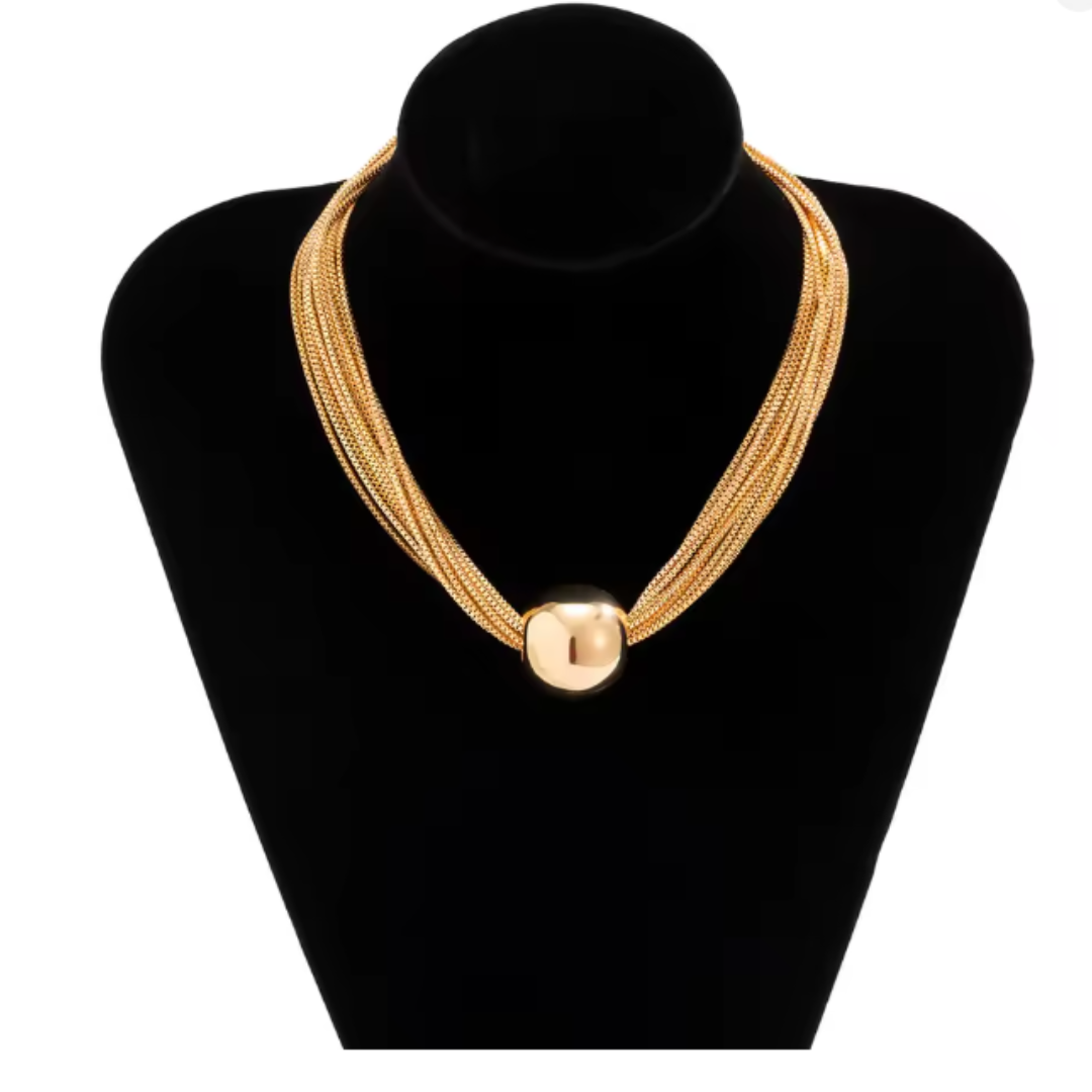 Wielowarstwowe, delikatne łańcuszki miękko otulają szyję i nadgarstek, tworząc spójną, harmonijną całość. Centralny element kolekcji – lustrzana, złota kula – symbolizuje perfekcję formy i równowagę pomiędzy minimalizmem a wyrazistym charakterem. Jej gładka, polerowana powierzchnia pięknie odbija światło, dodając stylizacjom luksusowego blasku.