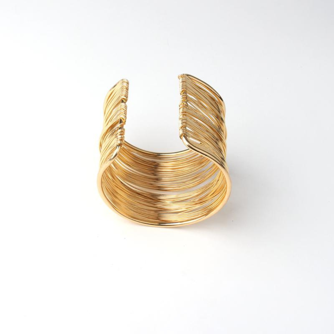 AURELIS WIRE to szeroka, otwarta bransoletka w kolorze złota, która przyciąga uwagę minimalistyczną, ale wyrazistą formą. Kompozycja cienkich, złotych linii tworzy efekt lekkiej siatki oplatającej nadgarstek.