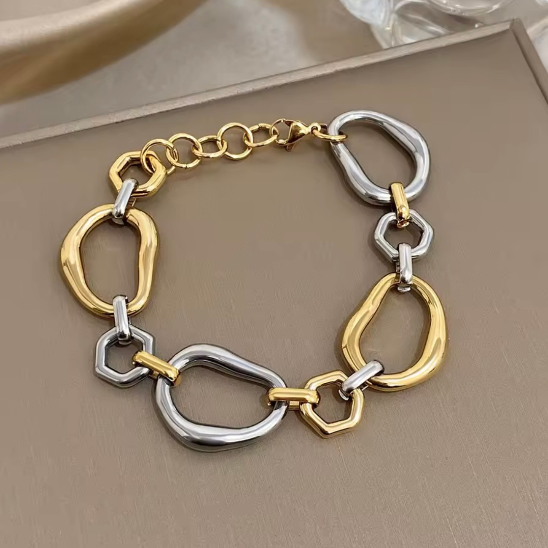 Wyrazista bransoletka łącząca złoto i srebro w jednej, nowoczesnej formie. Nieregularne, organiczne ogniwa tworzą dynamiczną kompozycję, która przyciąga wzrok i nadaje stylizacji charakteru.
