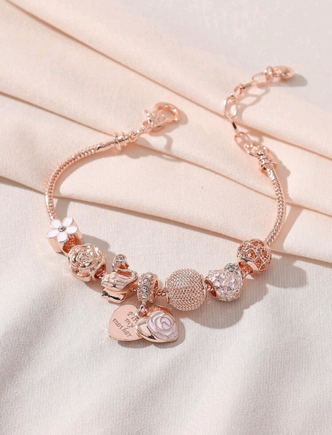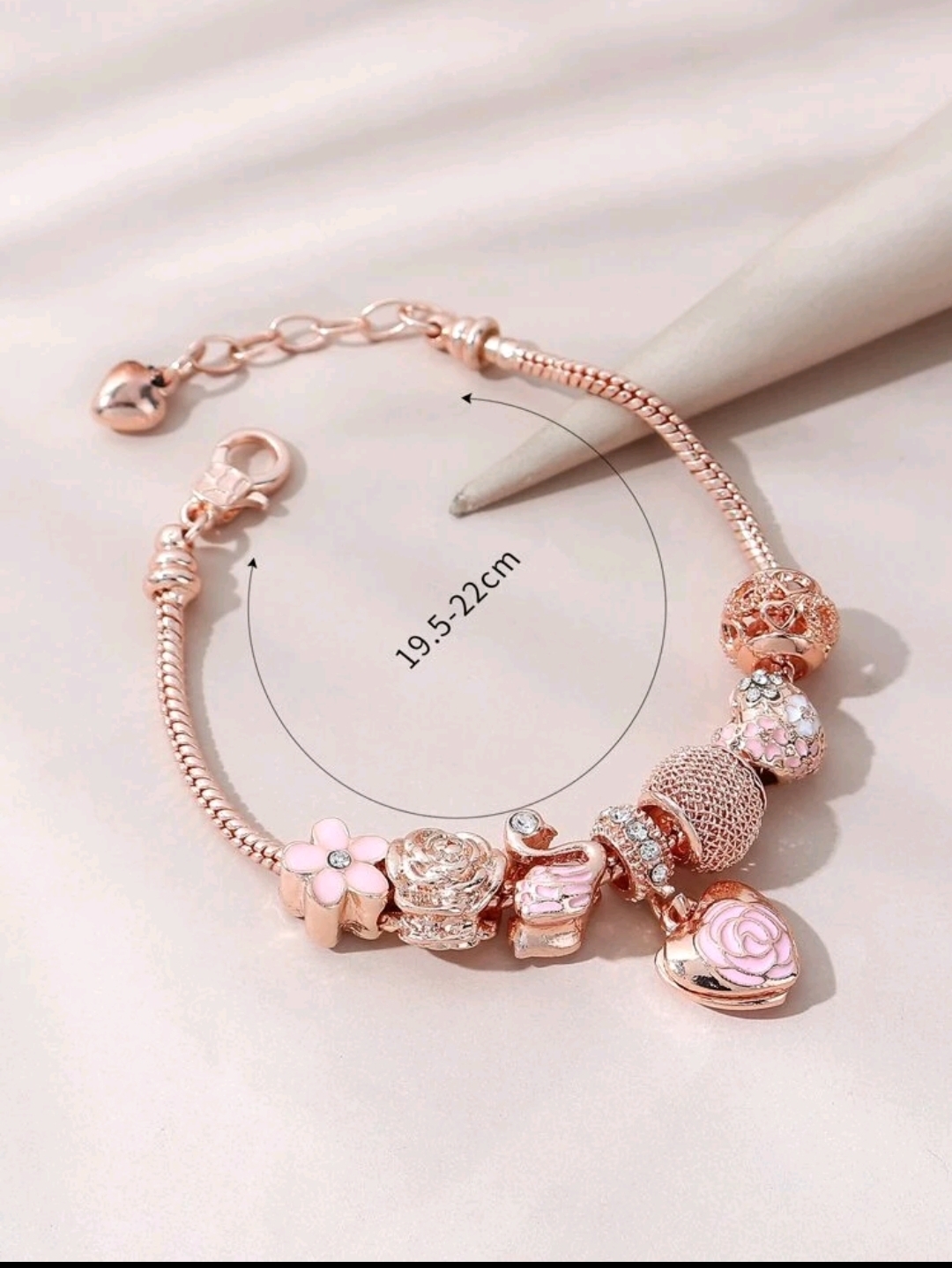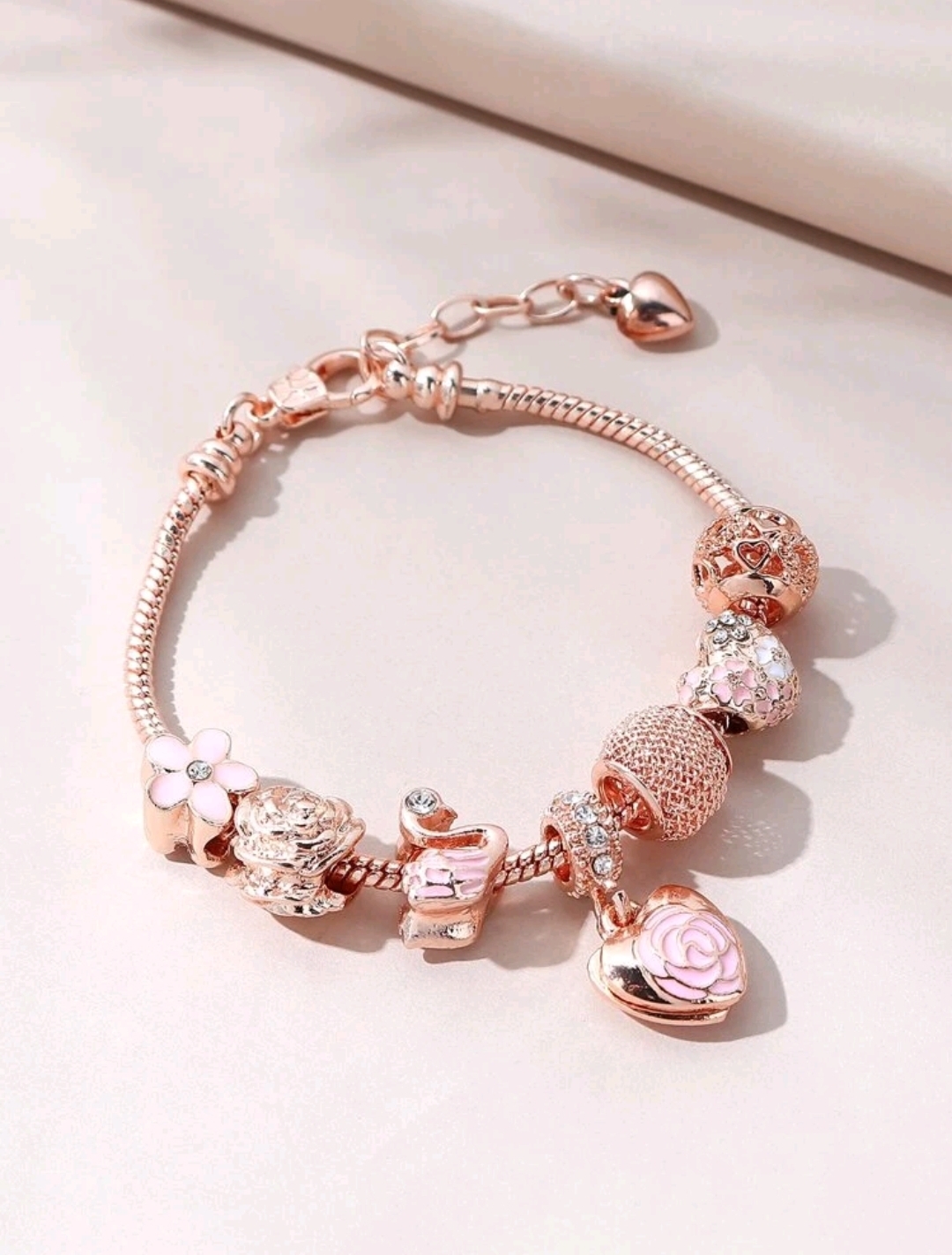 Bransoletka Heart Cascade – Rose Gold zachwyca romantycznym charakterem i subtelnym blaskiem różowego złota. Starannie dobrane charmsy – kwiaty, serca i dekoracyjne elementy z kryształkami – tworzą harmonijną kompozycję pełną kobiecej delikatności.