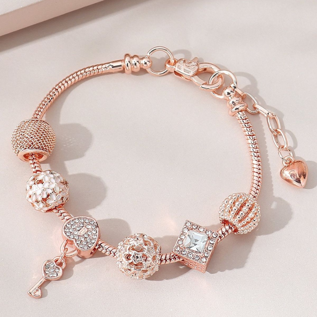 Elegancka bransoletka w odcieniu rose gold, inspirowana symboliką miłości, zaufania i kobiecej siły. Kompozycja ozdobnych elementów typu charms tworzy wyjątkową, biżuteryjną całość o luksusowym charakterze.