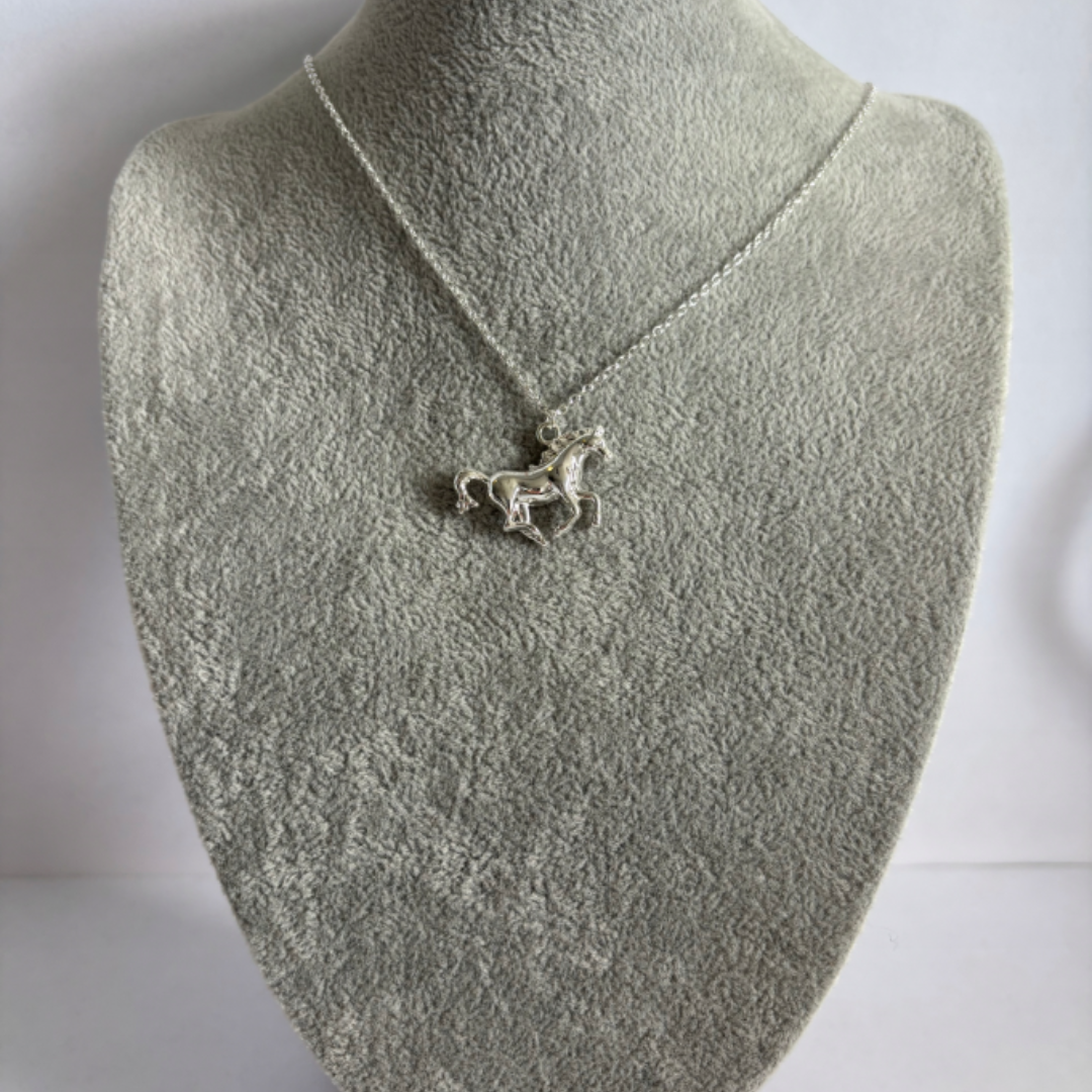 Wyrazisty symbol wolności i siły. Srebrny naszyjnik z kolekcji Jeździecka Elegancja przedstawia konia w ruchu – dynamiczną formę, która przyciąga uwagę i podkreśla charakter.