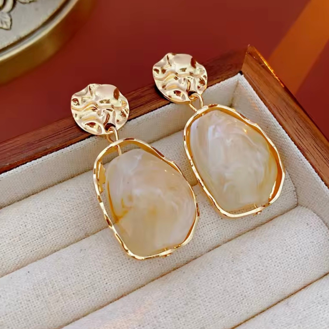 Eleganckie złote kolczyki z naturalnym kamieniem o mleczno-perłowym wykończeniu. Nieregularna forma kamienia sprawia, że każda para jest wyjątkowa i niepowtarzalna. Subtelna oprawa w złotym kolorze podkreśla naturalne użylenie i głębię kamienia, nadając całości luksusowy, artystyczny charakter.