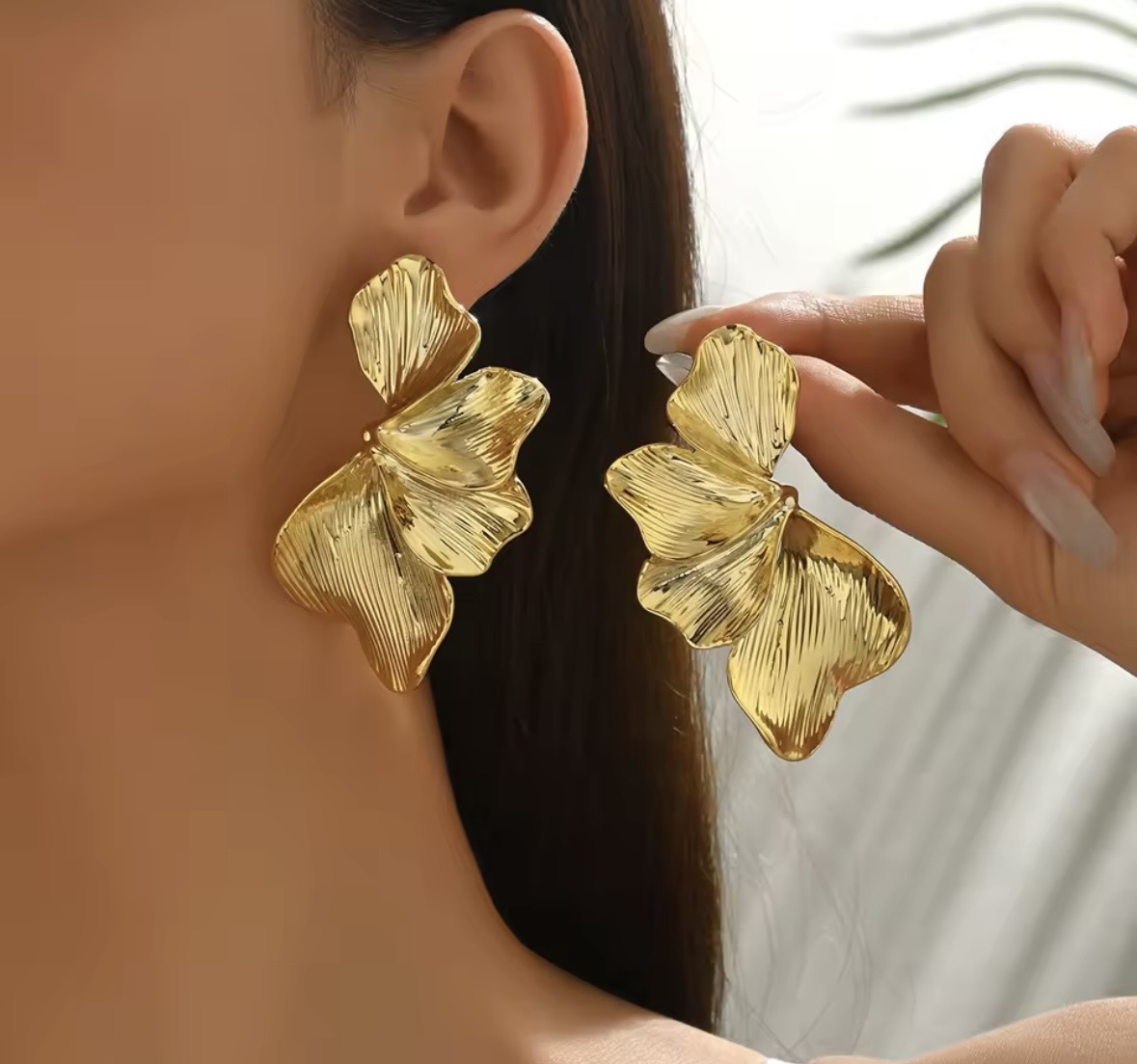 Eleganckie kolczyki w kolorze złotym o artystycznej formie płatków. Ich rzeźbiarska powierzchnia odbija światło i daje bardzo luksusowy efekt, mimo lekkiej formy kolczyków.