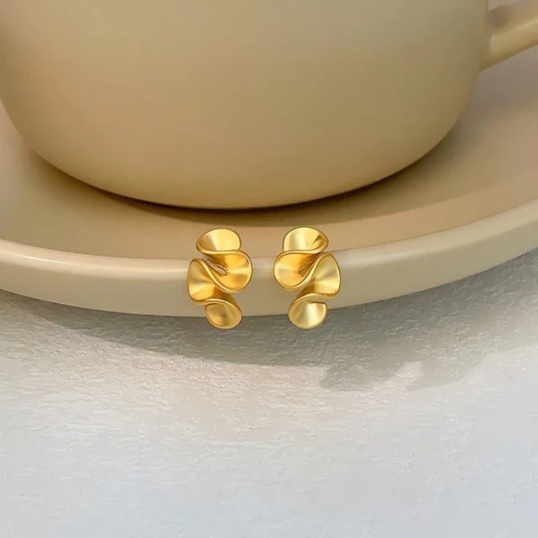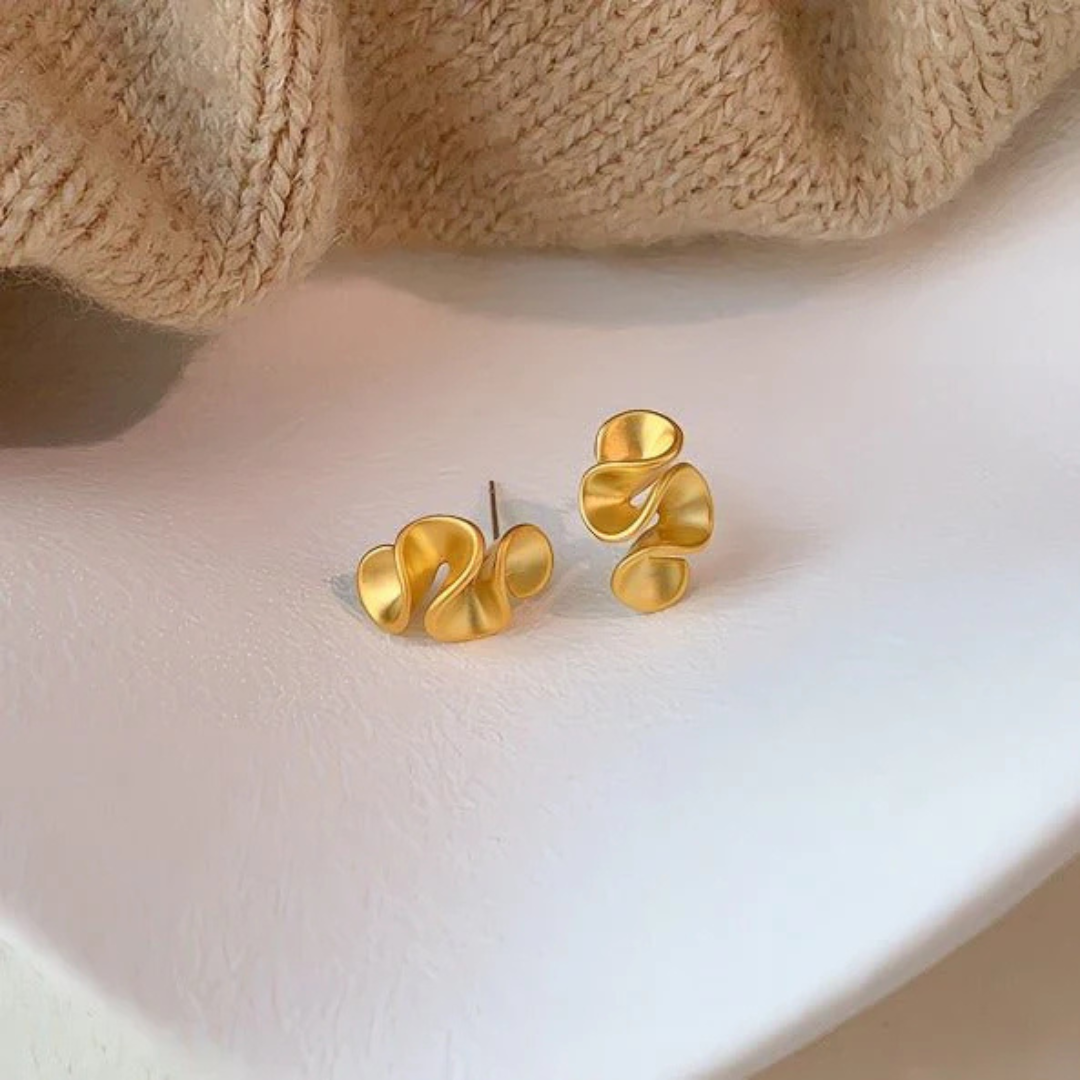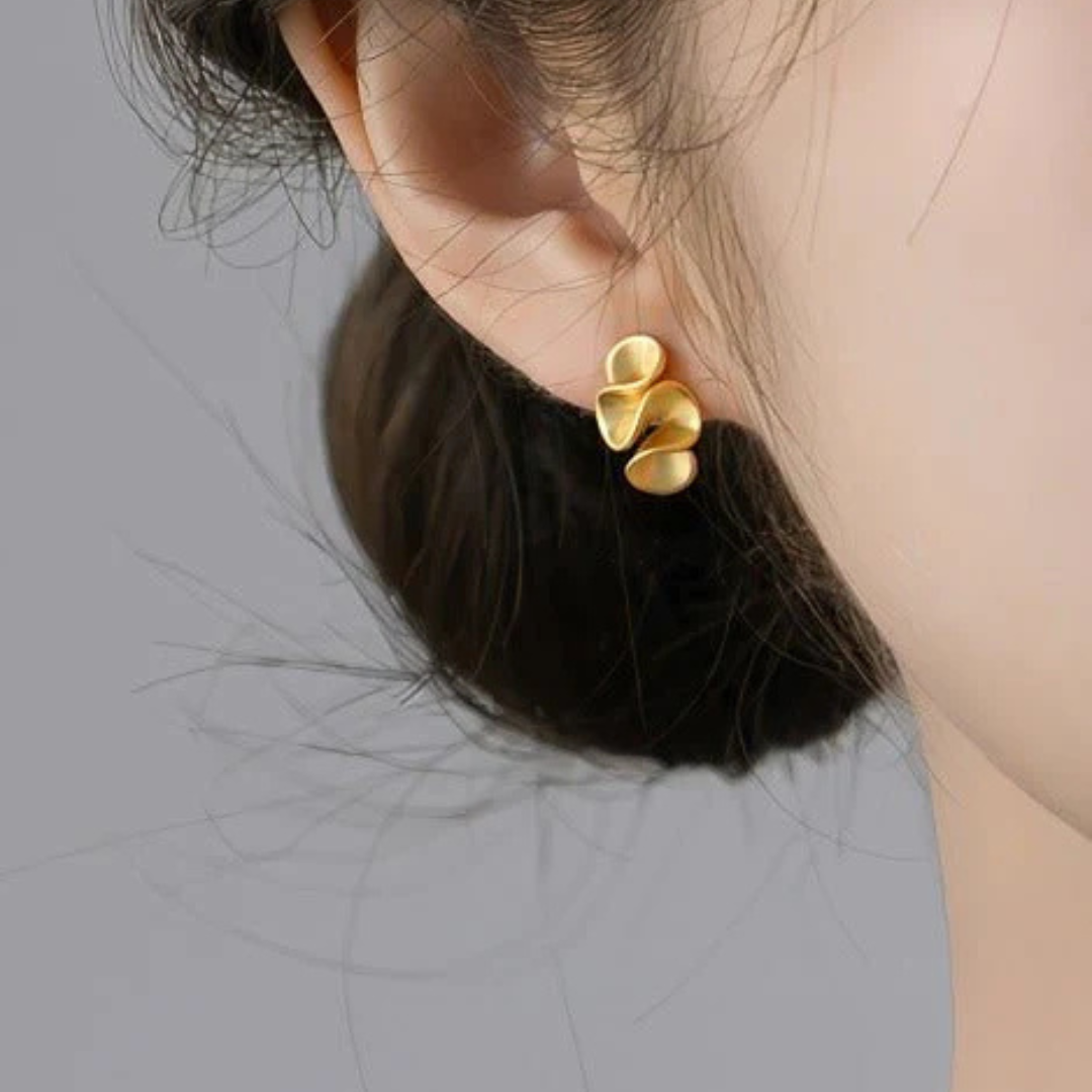 GOLDEN WAVE to biżuteria, która emanuje ciepłem i klasą. Organiczna, falująca forma w złotym wykończeniu przyciąga spojrzenia, jednocześnie pozostając elegancka i wyważona. Te kolczyki pięknie podkreślają rysy twarzy i dodają stylizacji luksusowego blasku bez przesady.