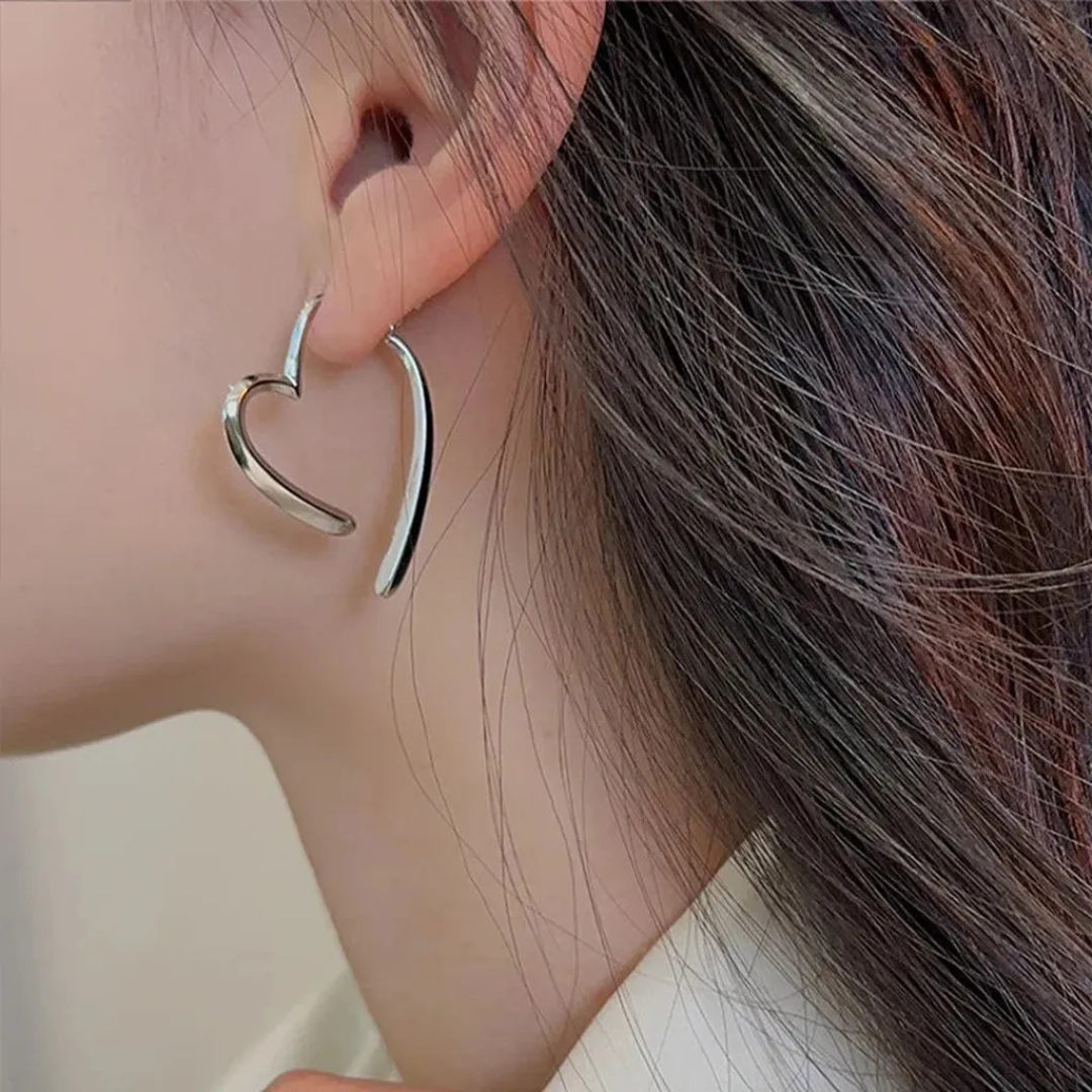 Delikatne kolczyki w kolorze srebrnym w formie nowoczesnego, otwartego serca. Lekka konstrukcja i opływowy kształt pięknie podkreślają rysy twarzy, dodając stylizacji świeżości i elegancji. Idealne dla kobiet, które kochają minimalizm z romantycznym akcentem.