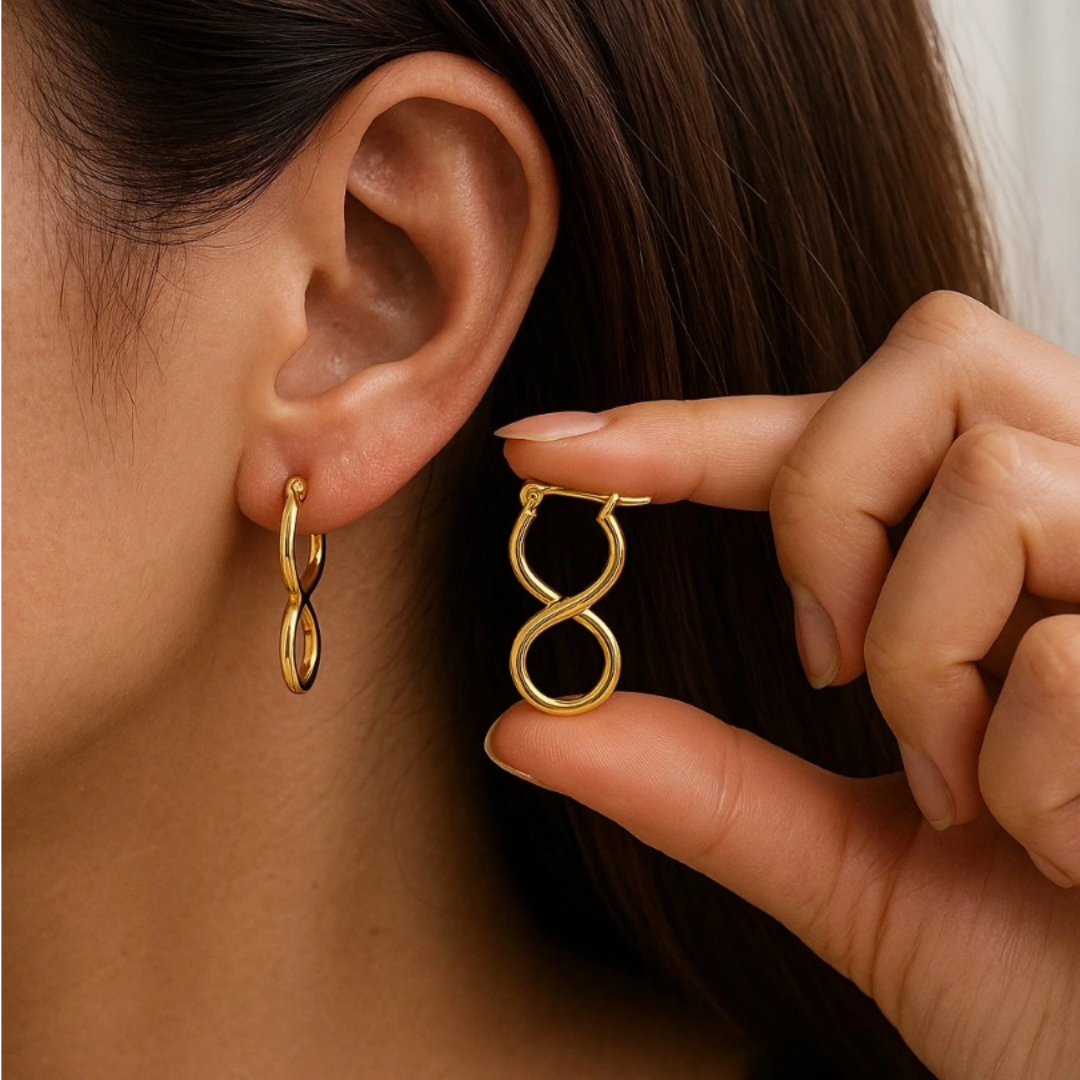 Eleganckie kolczyki o formie symbolu nieskończoności, które łączą minimalistyczny design z nowoczesną kobiecością. Gładka, złocona powierzchnia pięknie odbija światło, nadając biżuterii luksusowy, ale subtelny charakter.