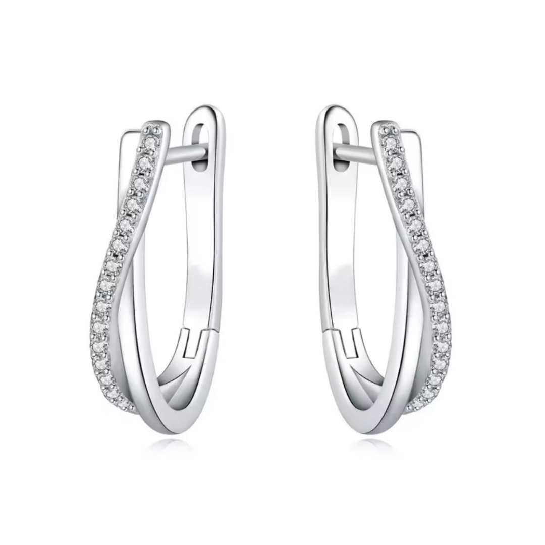 Eleganckie srebrne kolczyki o nowoczesnym, lekko skręconym kształcie, ozdobione rzędem delikatnych cyrkonii, które pięknie odbijają światło i dodają biżuterii subtelnego blasku. Kolczyki mają bardzo kobiecą, elegancką formę – są wyraziste, ale jednocześnie lekkie i klasyczne.