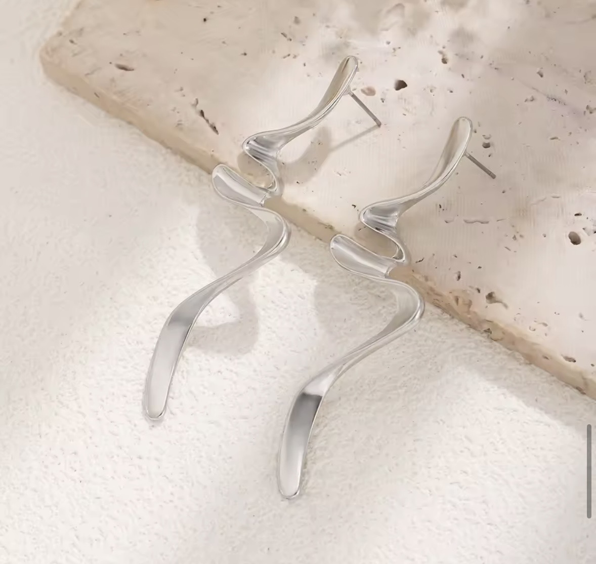 Te kolczyki nie są klasyczne. Nie są oczywiste. Mają organiczną, falującą linię, która miękko układa się przy twarzy i wydłuża szyję. To nowoczesna rzeźba w wersji biżuteryjnej – surowa, czysta, bardzo stylowa.