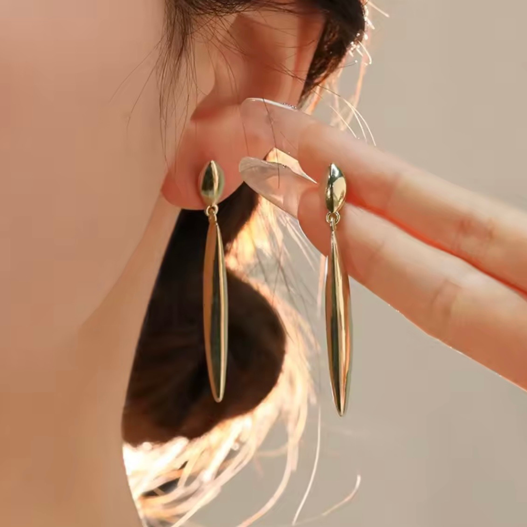 Górna część w kształcie subtelnej łezki harmonijnie łączy się z długim, geometrycznym elementem, tworząc elegancką linię, która optycznie wysmukla twarz i szyję.