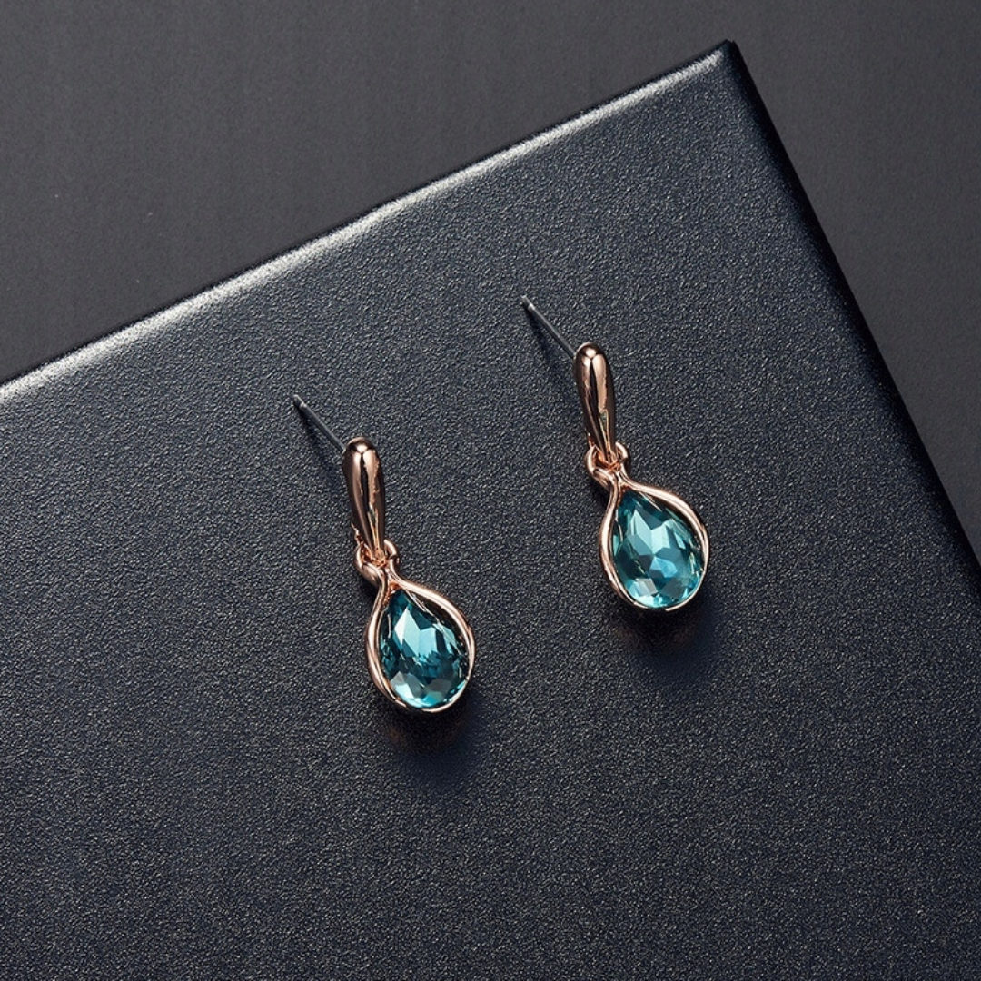 Szafirowy kolor symbolizuje klasę, tajemnicę i kobiecą siłę. Delikatna oprawa pięknie eksponuje kamienie, odbijając światło przy każdym ruchu. To komplet, który natychmiast przyciąga spojrzenia, ale pozostaje subtelny i niezwykle stylowy.