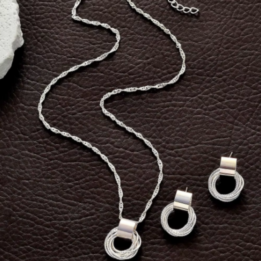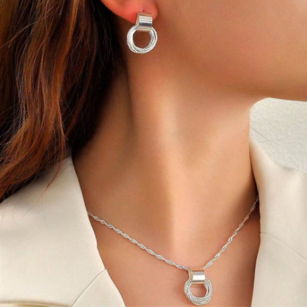 Nowoczesny komplet biżuterii inspirowany symbolem nieskończoności i harmonii form. Delikatne, wielowarstwowe okręgi w srebrnym odcieniu tworzą subtelny, a zarazem wyrazisty akcent, który doskonale uzupełni zarówno eleganckie, jak i codzienne stylizacje.