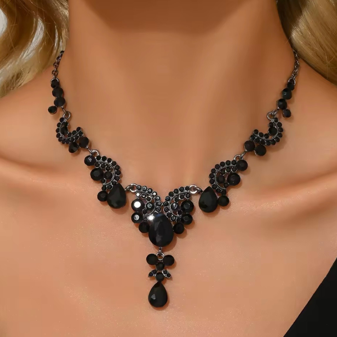 Bądź pierwszy, który oceni „Komplet biżuterii wieczorowej naszyjnik + kolczyki Noir Empress”