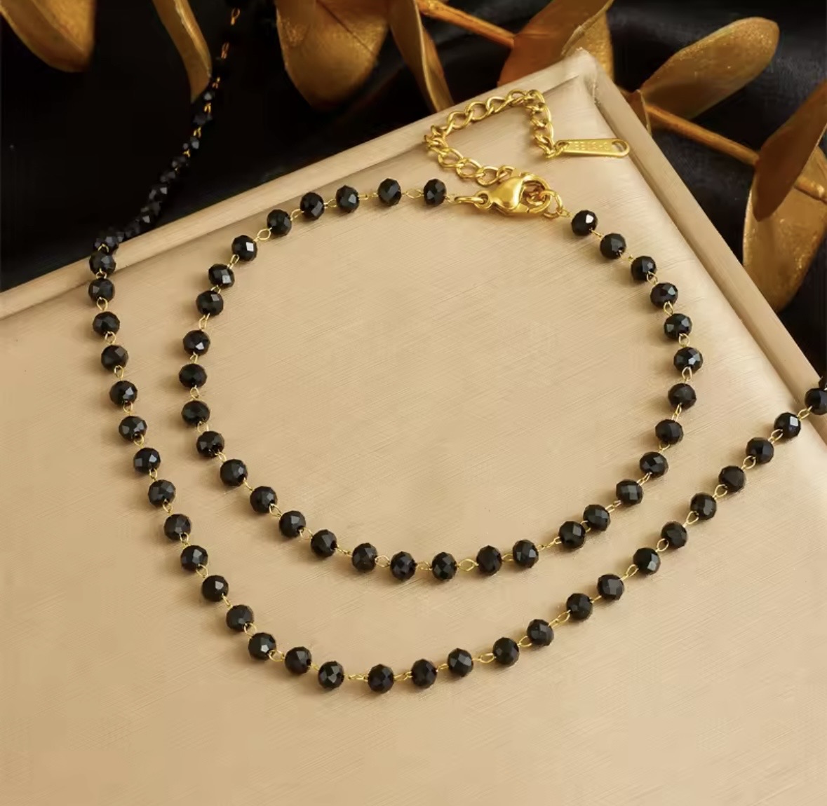 „Black Élite” to minimalistyczny komplet z drobnych, fasetowanych koralików w głębokiej czerni, połączonych delikatnymi, złotymi ogniwami. Światło odbija się od ich powierzchni subtelnie, ale wyraźnie – dając efekt elegancji bez przesady.