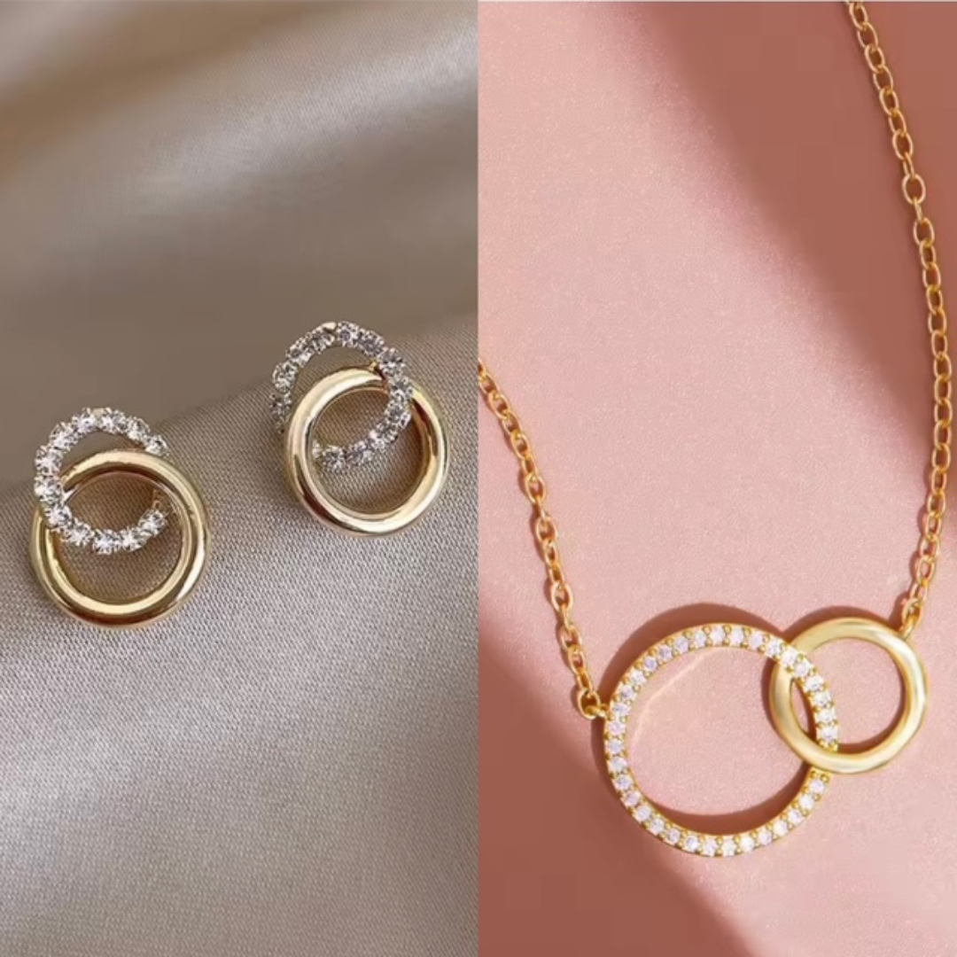 Subtelny i niezwykle kobiecy komplet biżuterii oparty na motywie dwóch przeplatających się kół, symbolizujących harmonię, bliskość i równowagę. Połączenie gładkiej, złotej obręczy z okręgiem wysadzanym drobnymi kryształkami tworzy elegancki kontrast i nadaje całości lekkości oraz klasy.