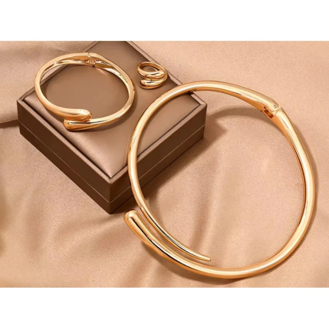 „Golden Sculpt Curve” to designerski komplet inspirowany płynnym złotem. Gładkie, lustrzane linie tworzą nowoczesny, rzeźbiarski efekt, który podkreśla szyję, nadgarstek i dłoń w sposób subtelny, ale wyrazisty. To idealny zestaw dla kobiet kochających elegancję w minimalistycznym, premium wydaniu.