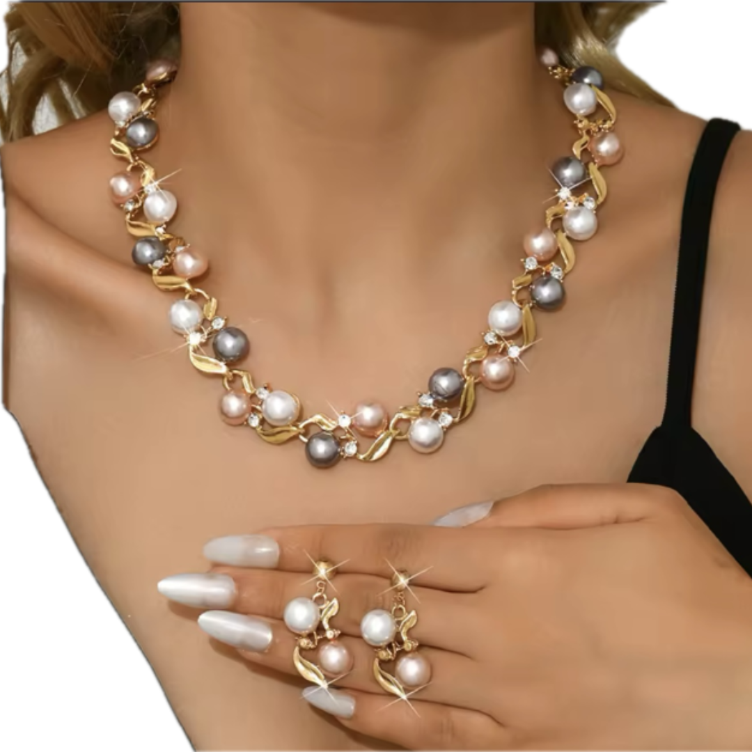 „Pearl Symphony” to połączenie złotej, miękkiej formy z kompozycją pereł w trzech odcieniach – pudrowego różu, chłodnej szarości i klasycznego perłowego blasku. Pomiędzy nimi subtelnie migoczą cyrkonie, które dodają światła, ale nie odbierają elegancji.