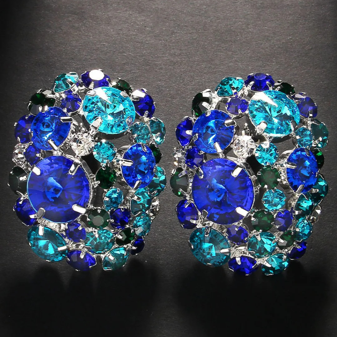 NOCTURNA ROYAL BLUE to wyraziste klipsy wysadzane wielobarwnymi kryształami w odcieniach głębokiego granatu, szafiru i turkusu. Centralne kamienie otoczone są mniejszymi, precyzyjnie osadzonymi kryształami, które odbijają światło przy każdym ruchu.
