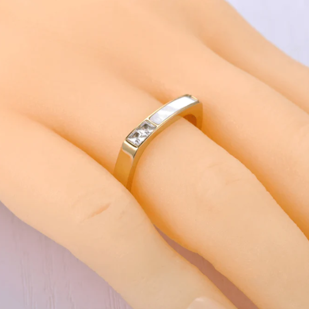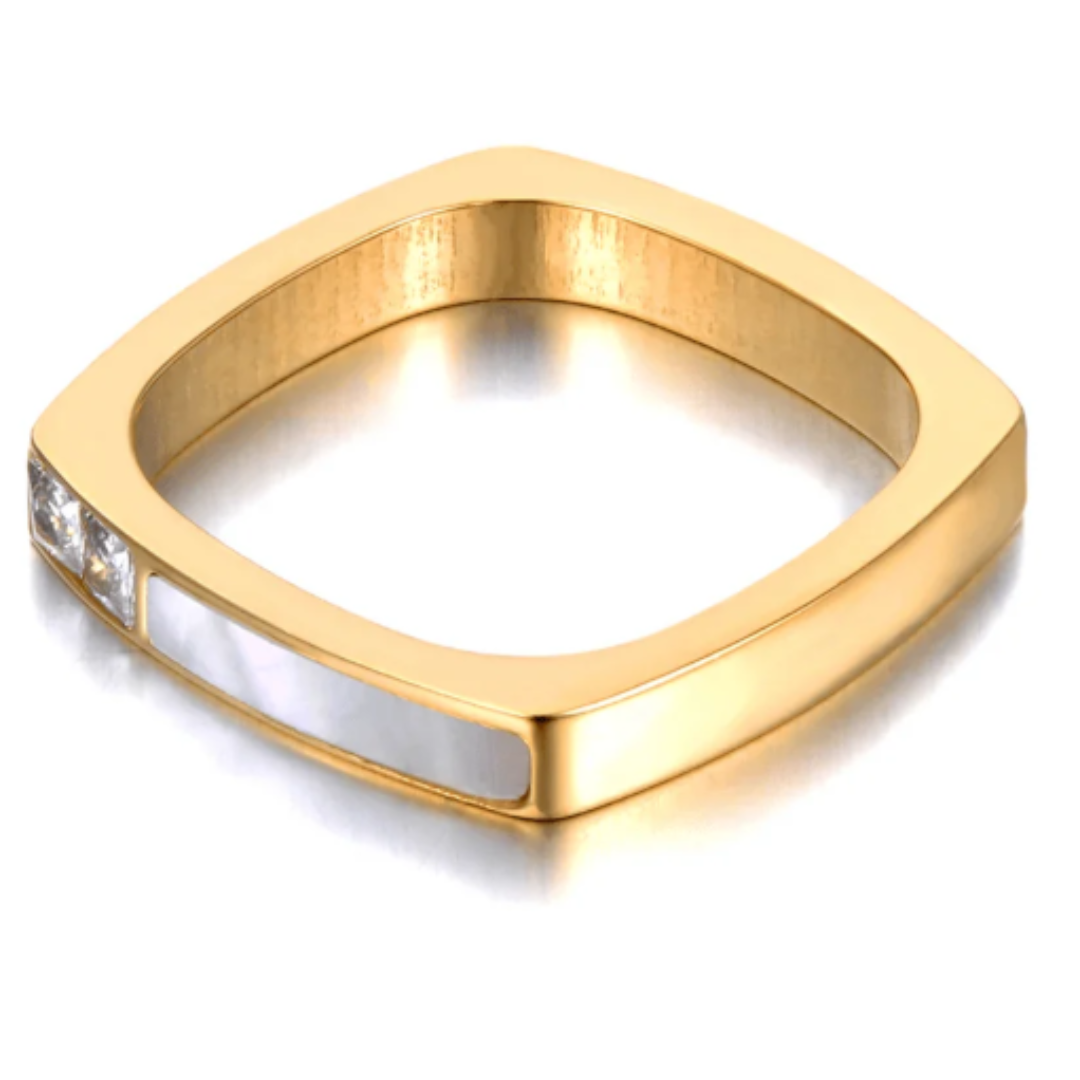 Elegancki pierścionek o nowoczesnej, geometrycznej formie, wykonany ze stali nierdzewnej pozłacanej potrójną warstwą złota. Ozdobiony delikatną masą perłową oraz cyrkoniami AAA, które subtelnie odbijają światło.