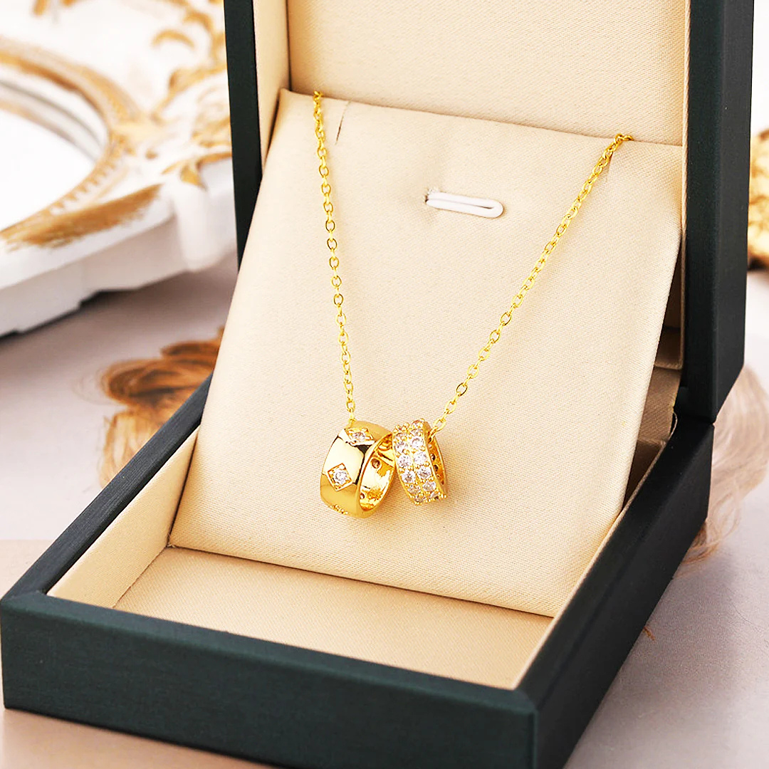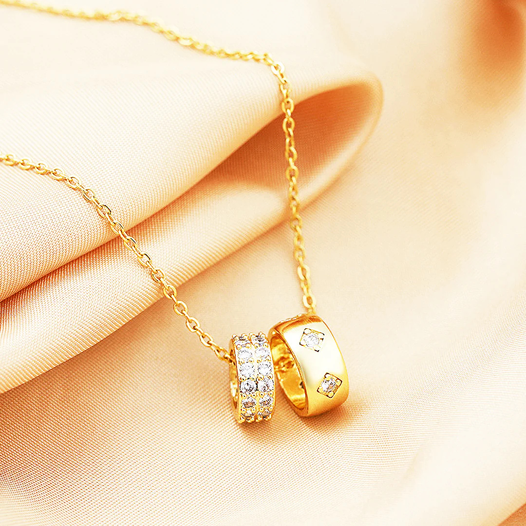 Nowoczesny naszyjnik damski z geometrycznym wisiorem w formie dwóch kół, ozdobionych drobnymi cyrkoniami. Połączenie gładkiej, złotej powierzchni z delikatnym blaskiem kamieni tworzy elegancki, a jednocześnie wyrazisty efekt.