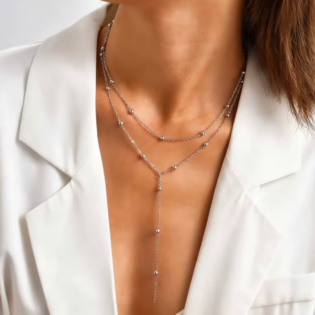 LUNARIA DROP – Silver Elegance to esencja nowoczesnej kobiecości zamknięta w subtelnej formie lariat. Delikatne, podwójne łańcuszki tworzą efekt warstwowości, a pionowo opadający detal optycznie wysmukla dekolt i szyję. Minimalistyczny, ale niezwykle zmysłowy – idealny zarówno do codziennych stylizacji, jak i wieczornych, eleganckich looków.