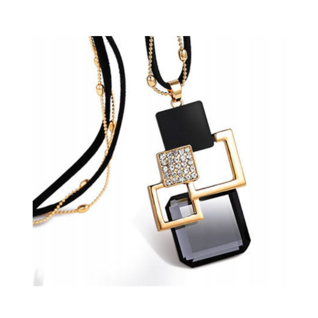 Elegancki naszyjnik damski z geometrycznym wisiorem, który łączy klasyczną czerń z ciepłym złotem i subtelnym blaskiem cyrkonii. Kompozycja kwadratów o różnej strukturze – gładkich, błyszczących i zdobionych – tworzy nowoczesny, wyrazisty design.
