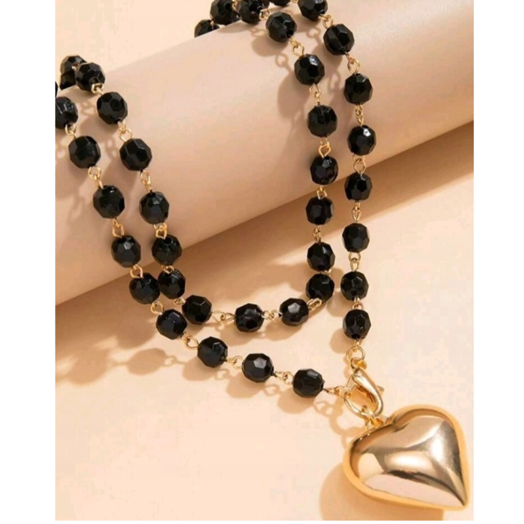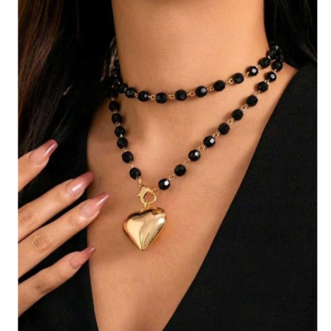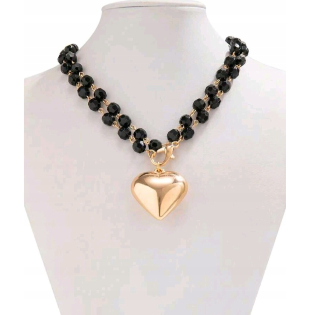 Elegancki, a jednocześnie wyrazisty naszyjnik wykonany z fasetowanych czarnych kamieni, połączonych złotymi ogniwami. Centralnym elementem jest lśniące, złote serce, które pięknie odbija światło i przyciąga spojrzenia.