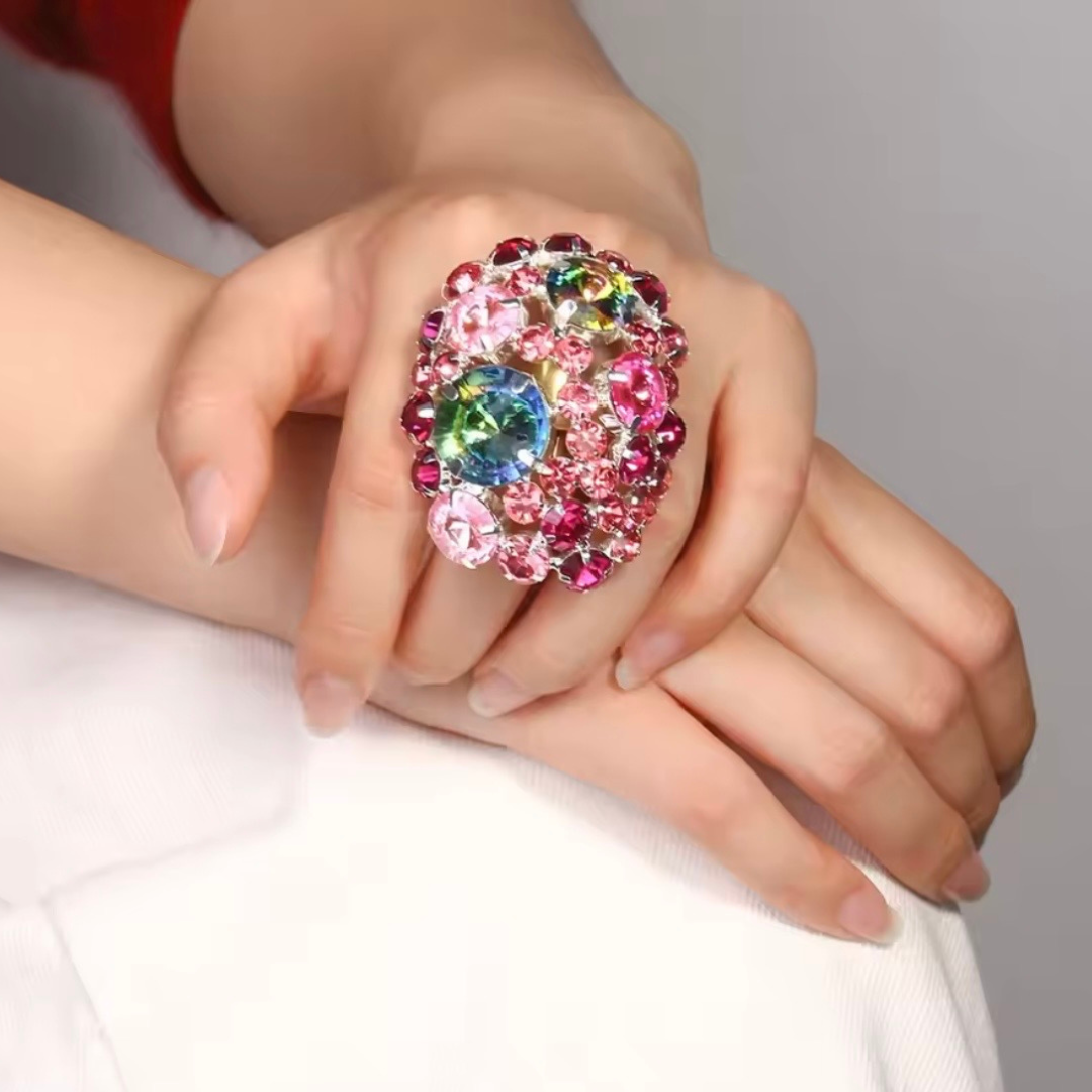 AURORA BLOOM ROSE to spektakularny pierścionek o kwiatowej kompozycji, wysadzany wielobarwnymi kryształami w odcieniach malinowego różu, rubinu oraz opalizujących kamieni z efektem tęczy.
