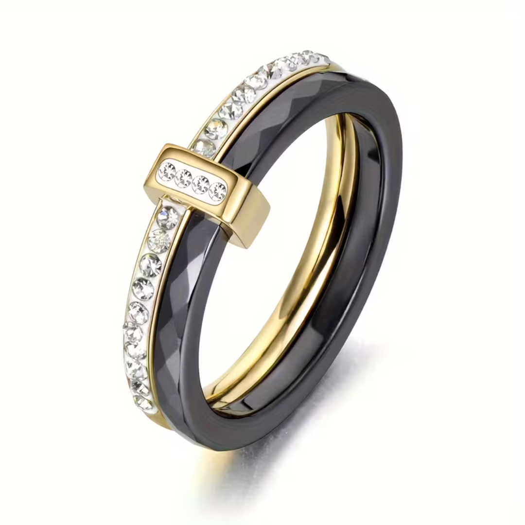 Lśniąca czarna obręcz pięknie kontrastuje z pozłacanym akcentem, wysadzanym połyskującymi cyrkoniami premium.