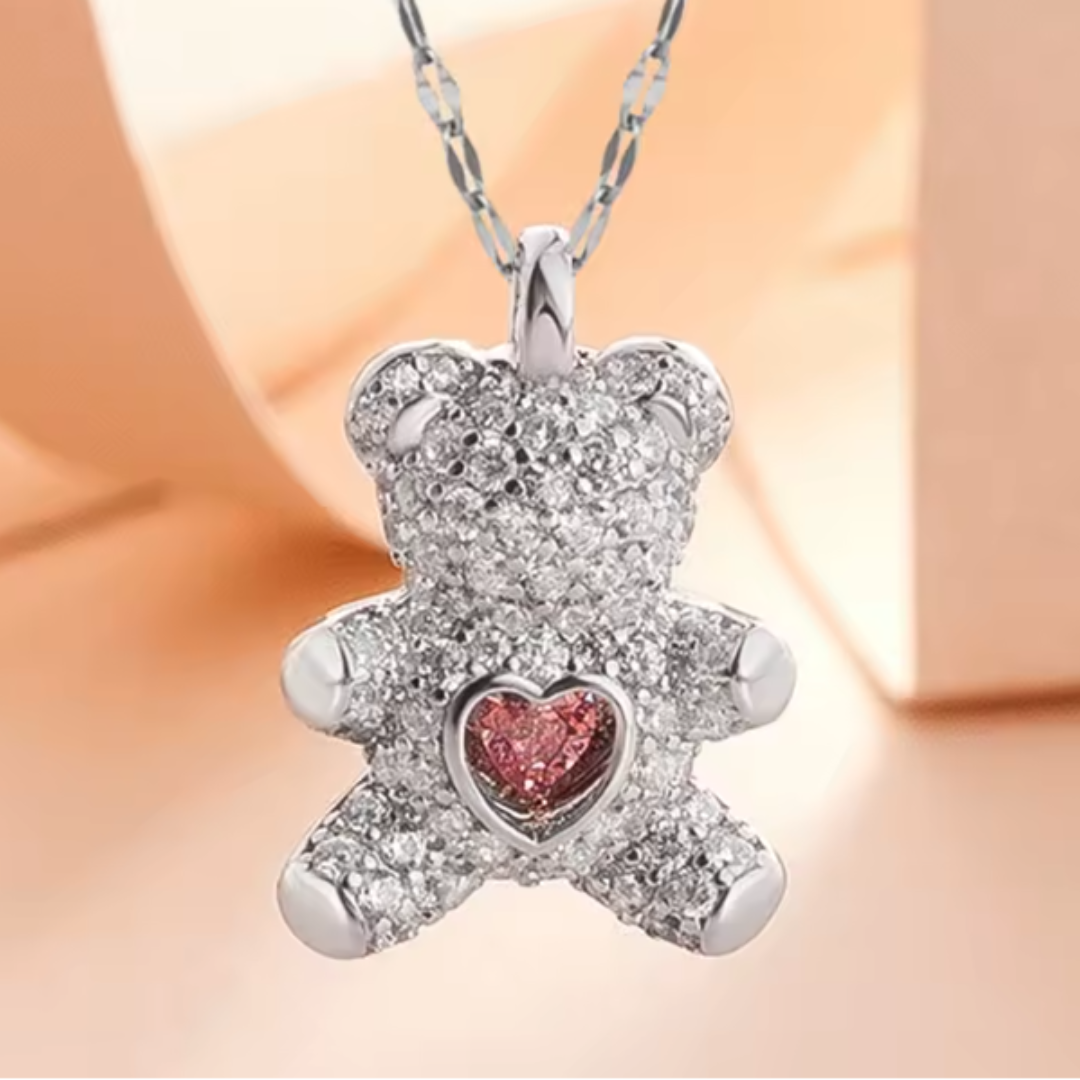 Wisiorek LOVE BEAR SILVER to klasyczna i ponadczasowa propozycja dla miłośniczek chłodnej elegancji. Srebrny miś, bogato zdobiony drobnymi cyrkoniami, subtelnie odbija światło, tworząc efekt delikatnego blasku. Serce umieszczone w centralnej części symbolizuje miłość, bliskość i emocje zamknięte w eleganckiej formie.