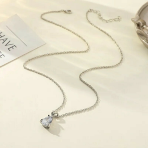 Elegancki naszyjnik z zawieszką w kształcie serca, zawieszony na charakterystycznym łańcuszku typu żmijka, który pięknie układa się na szyi i nadaje biżuterii nowoczesny, szlachetny wygląd.