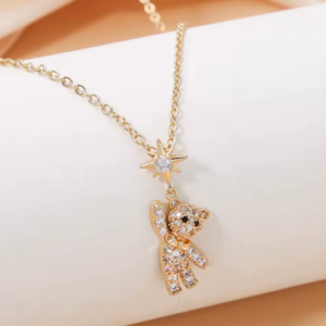 Naszyjnik LOVE BEAR – Star to wyjątkowe połączenie blasku i emocji. Złoty miś wysadzany lśniącymi cyrkoniami zawieszony jest pod delikatną gwiazdką, która symbolizuje miłość, marzenia i szczęście.