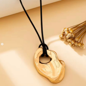 Oryginalny naszyjnik LUMEN ARC z artystyczną, nieregularną zawieszką w kolorze złota. Jego organiczny kształt przyciąga uwagę i nadaje stylizacjom wyjątkowego charakteru. Zawieszka osadzona jest na czarnym, regulowanym sznurku, który podkreśla nowoczesną formę i zapewnia wygodę noszenia.