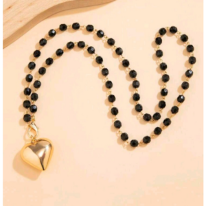 Elegancki, a jednocześnie wyrazisty naszyjnik wykonany z fasetowanych czarnych kamieni, połączonych złotymi ogniwami. Centralnym elementem jest lśniące, złote serce, które pięknie odbija światło i przyciąga spojrzenia.