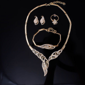 Centralnym elementem zestawu jest misternie zaprojektowany naszyjnik, którego zdobione cyrkoniami skrzydła subtelnie rozświetlają dekolt, tworząc efekt biżuterii o charakterze jubilerskim. Każdy detal — od kolczyków, przez bransoletkę, aż po pierścionek — zachowuje idealną spójność formy i blasku, tworząc harmonijną, niezwykle elegancką całość.